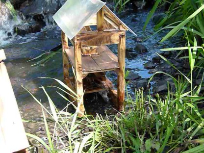 Stangen- und Wasserkunst in Bad- Salzhausen. Im orig. wurde die Energie von dem in Kohden an der Nidda stehenden Wasserrad mittels einem ca 1,8 km langen Gestänge zu den Pumpen an den Gtradierwerken gebracht. Auch wurde Niddawasser in Vorratsteiche im Park gepumpt. Mit diesem Wasser aus den Teichen wurden wiederum 7 andere Wasserräder angetrieben. Dieses Modell funktioniert nur mit Wasserantrieb, als kein elektrisches Motörchen verbaut. (links das Wasserrad, rechts oben das Umlenkhäuschen, vorne unten das Gradierwerk)